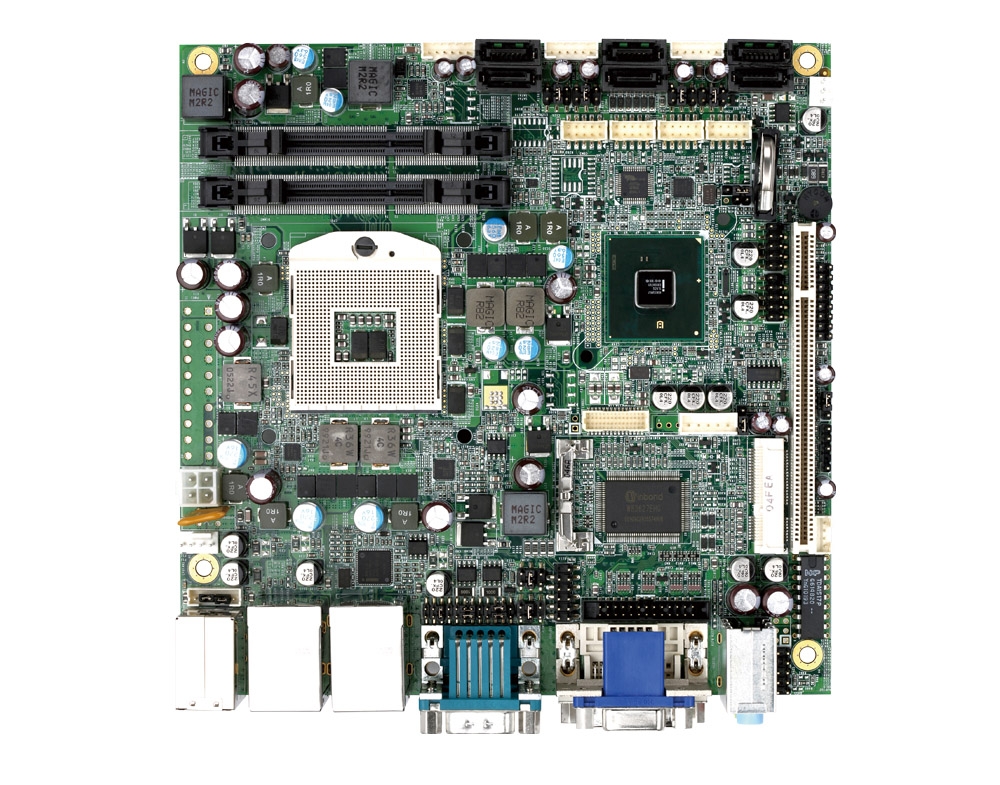 1st Gen. Intel® Core™ i7/i5/i3/ Celeron® processors with Intel® QM57 chipset | Two 204-pin SO-DIMM up to 8GB DDR3 800/1066MHz SDRAM | Dual Display: VGA/DVI-D/LVDS | Two Intel® Gigabit Ethernet ports | 1 PCI and 1 Mini-PCIe expansion slots | 6 SATA II, 6 COM and 10 USB 2.0 | RAID 0, 1, 5, 10 supported