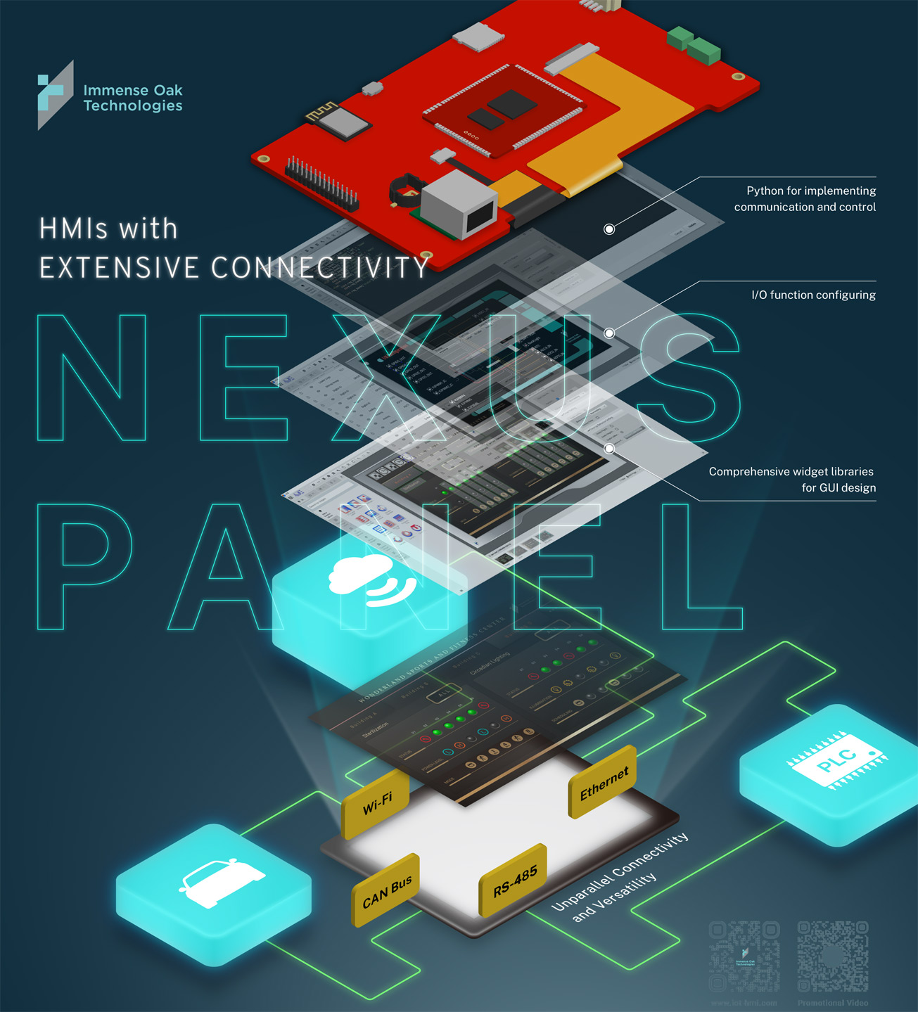 Immense Oak Technologies HMI modules natively support numerous I/O, such as GPIO, PWM and ADC. Specific Extension Boards are provided for communication needs to be installed on top of the standard control board. They are customizable according to customer needs and support Ethernet, WiFi, BT, RS-485, RS-232, CAN Bus and combinations of these interfaces.